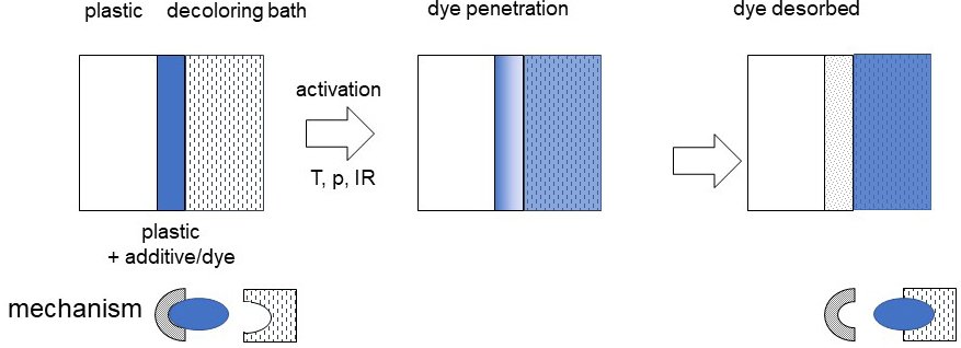 The decolorization, the resolving of the dyestuffs, takes place in an aqueous decolorizing bath at elevated temperature with the addition of dye absorbers. The plastics "open" and release the dyestuffs. These, in turn, are absorbed by the absorbers in the water and removed from the washing water.